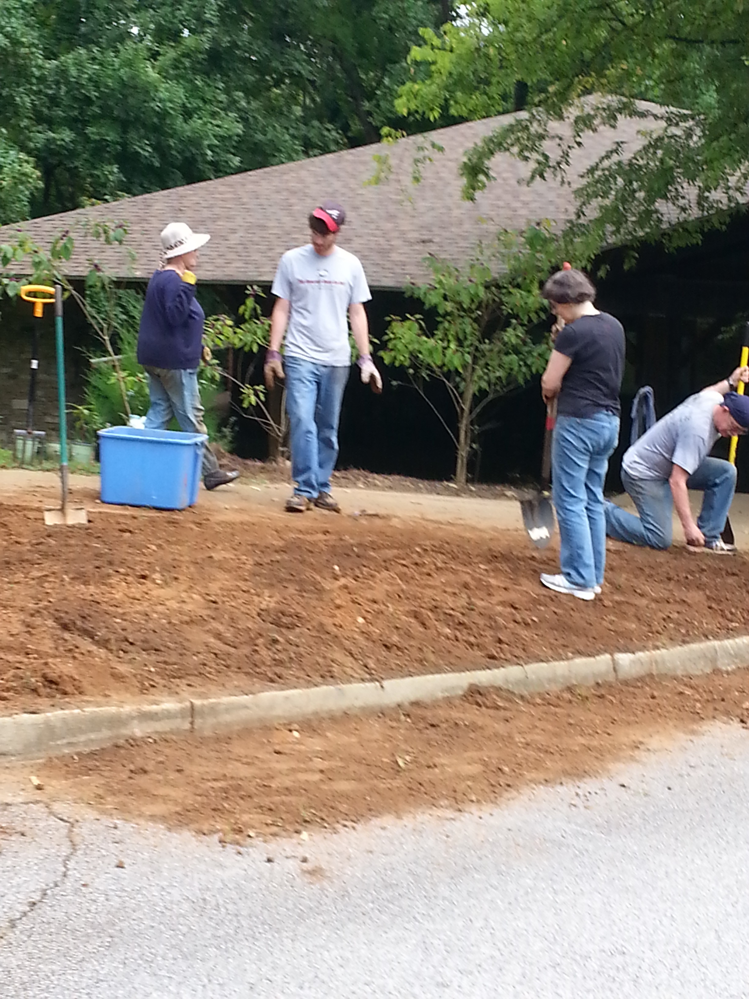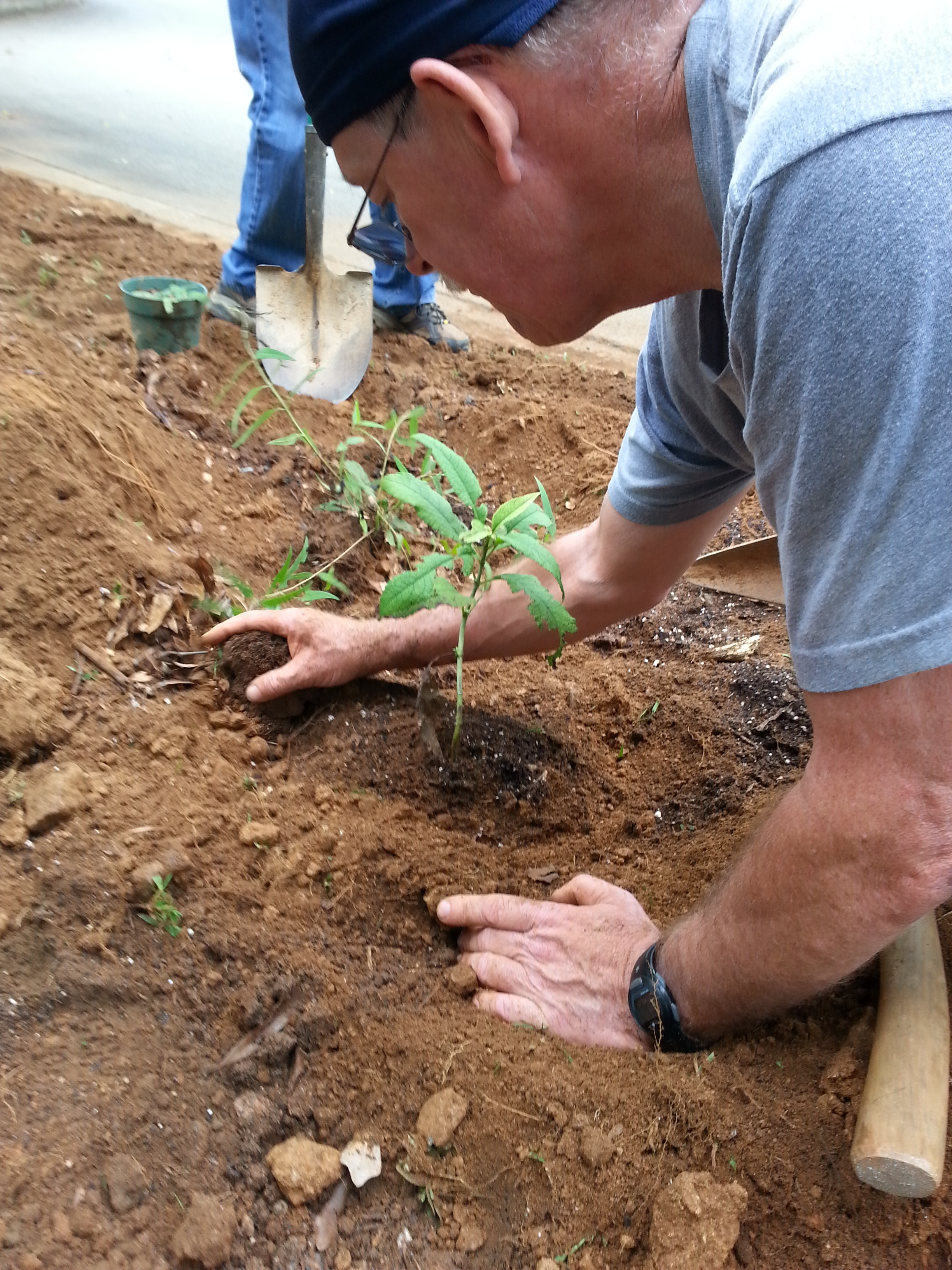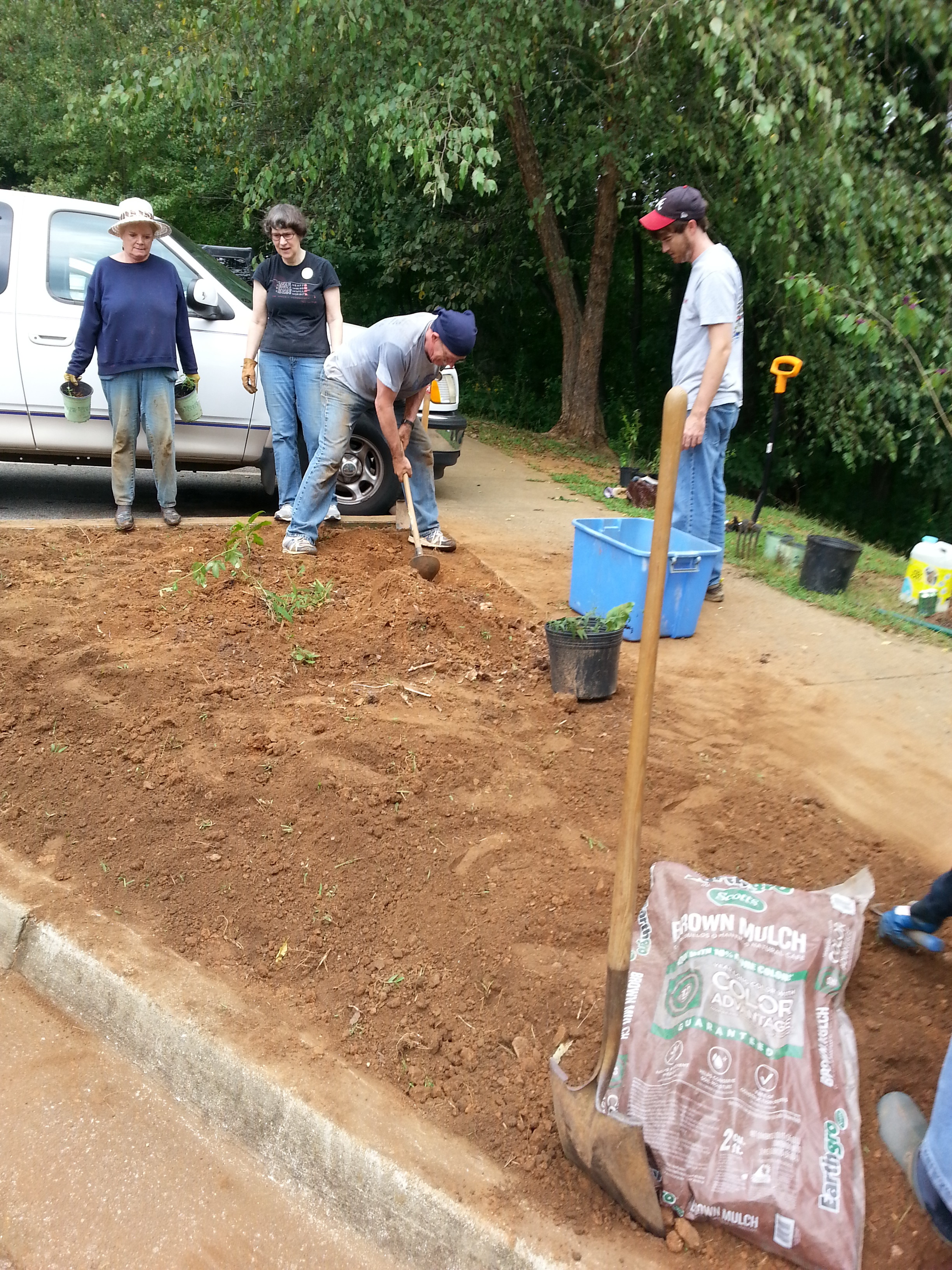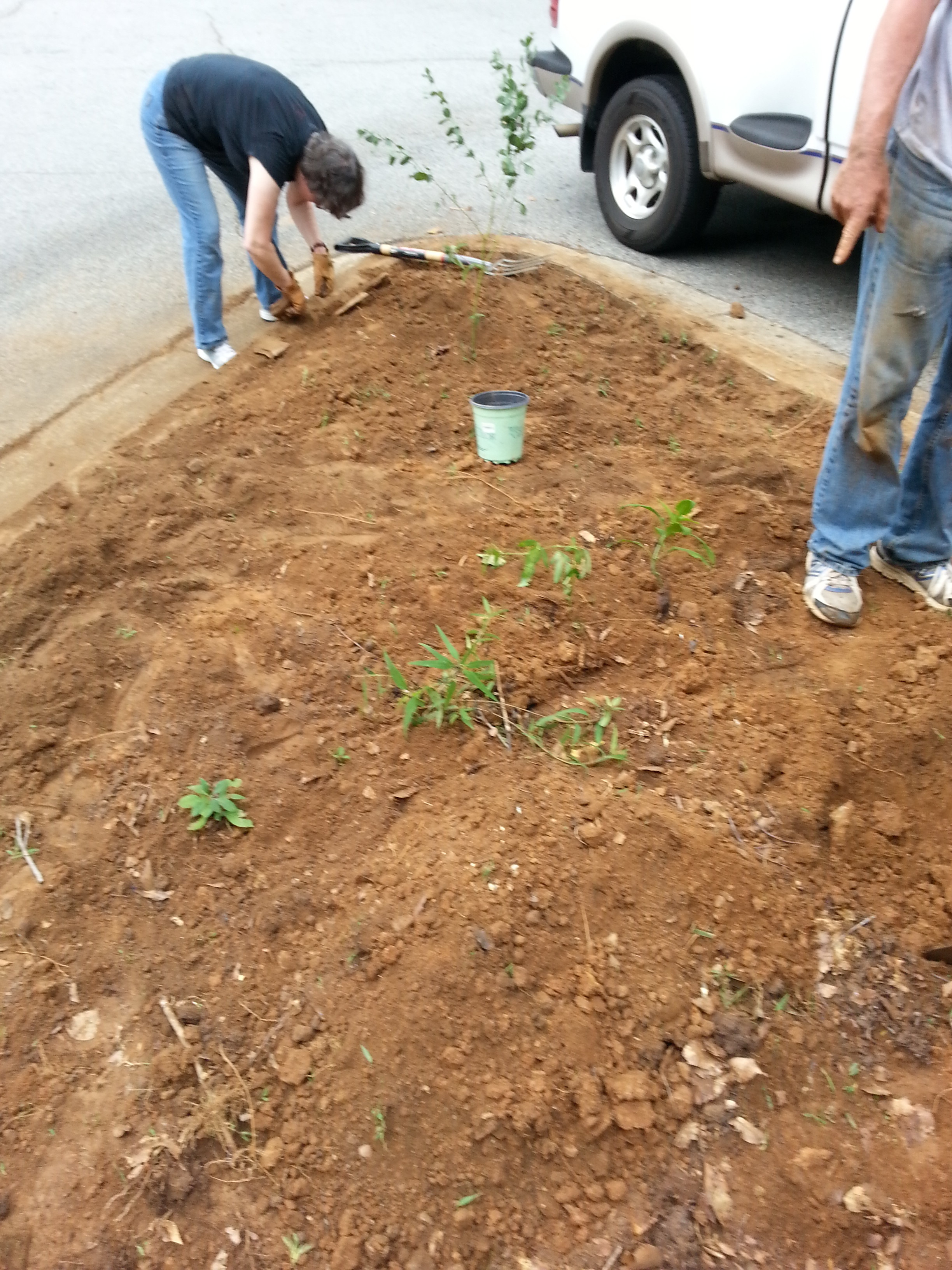 The soil was challenging, comprised of a mix of red clay and small rocks covered with a thin layer of topsoil, and carpeted with crabgrass. Using a combination of forks and shovels, the volunteers tilled the area.