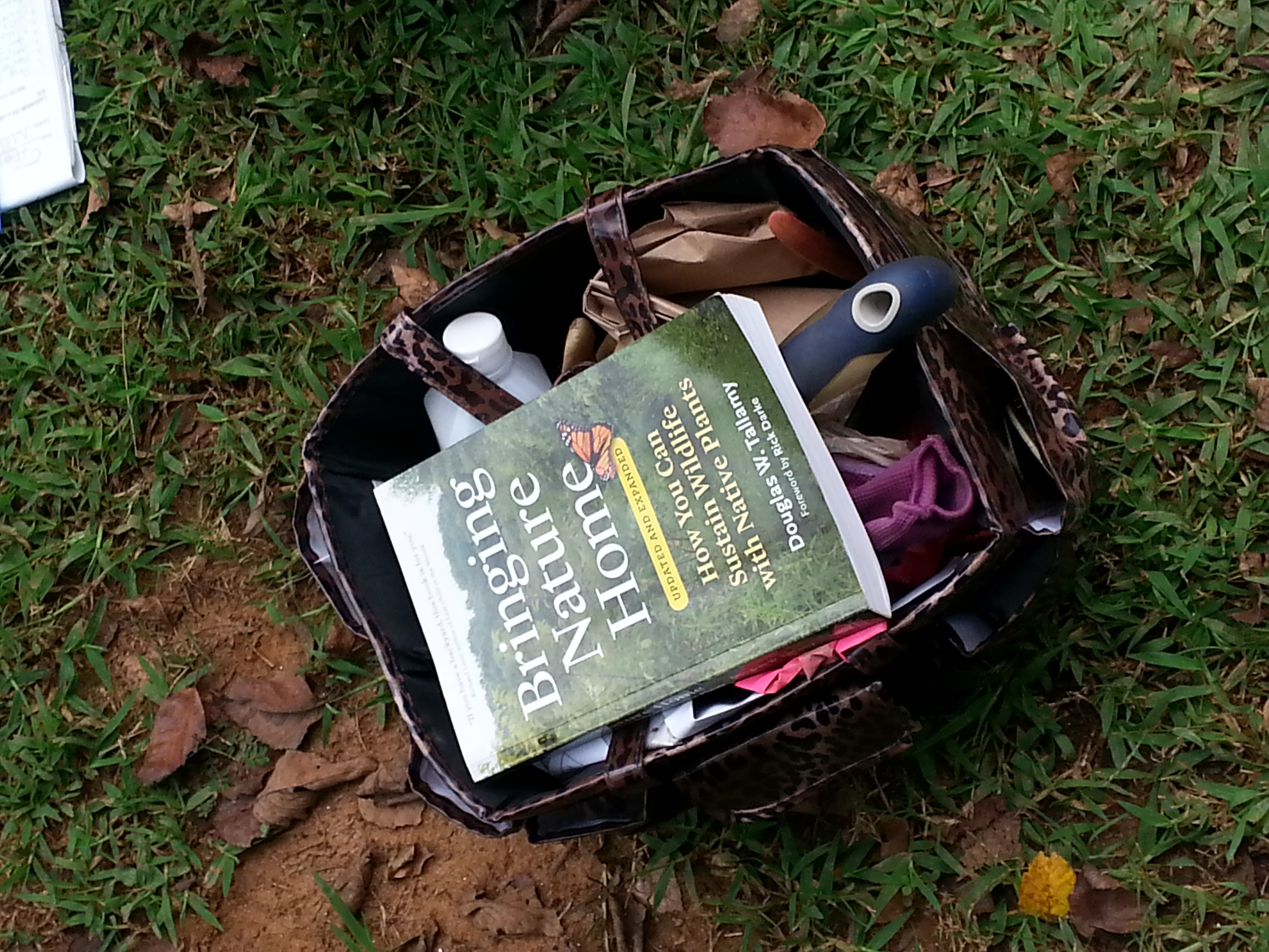 Saturday morning was the monthly workday session at Heritage Park, organized by the Georgia Native Plant Society. This month’s project was to dig up a small triangular patch of land bordering the parking area off Nickajack Road, and to replace the lawn, dominated by crabgrass, with butterfly-attracting native plants.