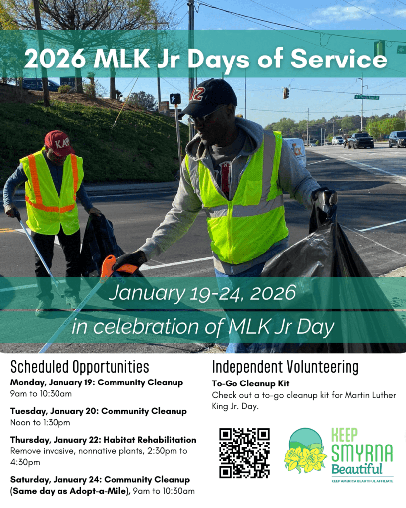 Keep Smyrna Beautiful will host its 2026 Martin Luther King Jr. Days of Service from January 19–24, 2026 with a variety of volunteer opportunities throughout Smyrna. Volunteer opportunities include multiple litter cleanups and a habitat rehabilitation project focused on removing invasive, non-native plants. Registration required through Hands On Atlanta. For full event details and registration links, visit https://bit.ly/KSBVOLMLK2026. KSB is also offering an option for independent volunteering using a to-go cleanup kit that can either be checked out from the Smyrna Public Library or requested directly from KSB.