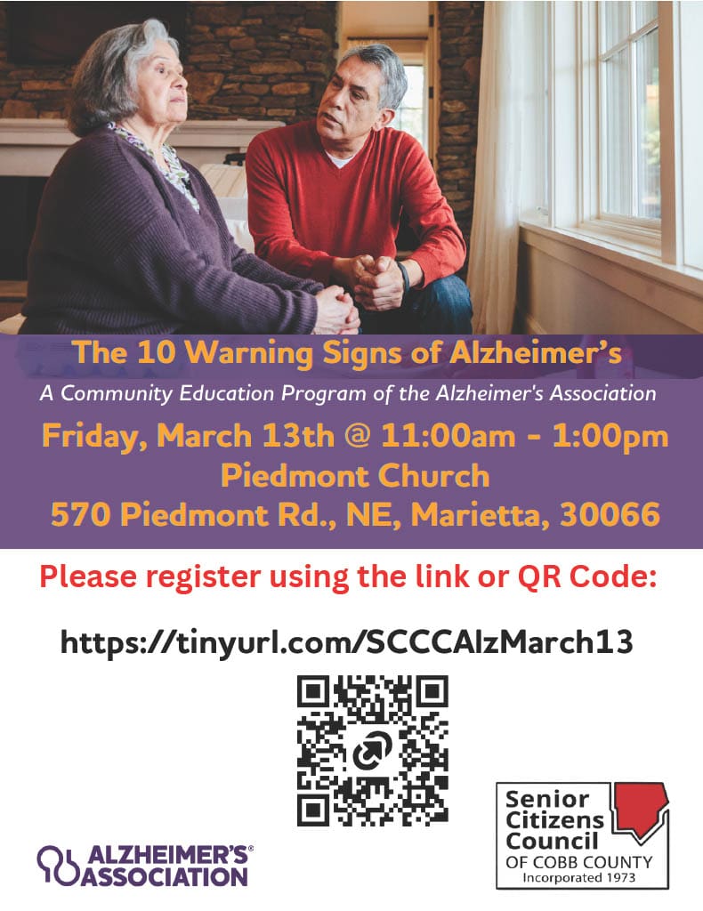 The Senior Citizens Council of Cobb County and the Alzheimer’s Association will cohost an event, “The 10 Warning Signs of Alzheimer’s”