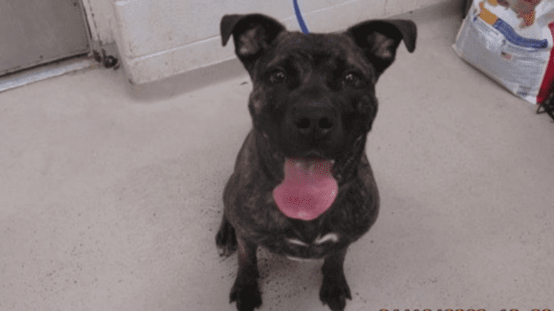 The Cobb County Courier’s Dog of the Day, selected from the Cobb Animal Services Shelter website, is a male brindle/white American pit bull terrier.